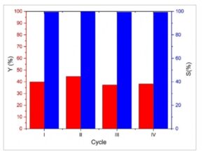 Uji daur ulang dilakukan untuk katalis yang paling aktif. Setelah setiap pengujian, katalis dicuci secara menyeluruh dengan etanol dan air suling, yang kemudian dihilangkan dengan mengeringkan katalis semalaman pada suhu 70 °C.